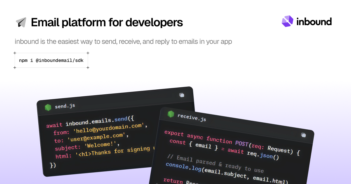 What makes Inbound special: • Simple SDK that works out of the box • No SMTP configuration required • Built-in webhook support for receiving emails • Auto-reply functionality for building AI agents • Resend-compatible API • Full TypeScript support
