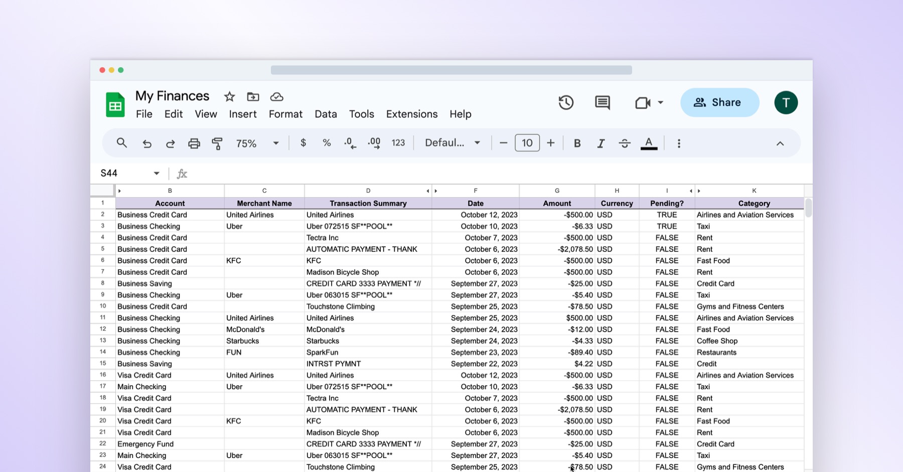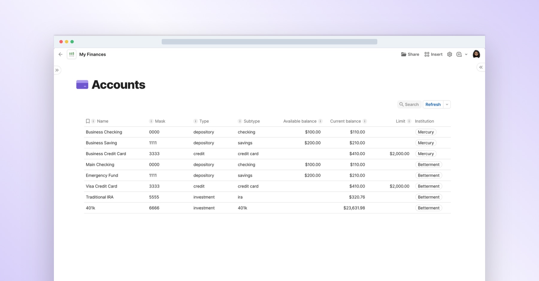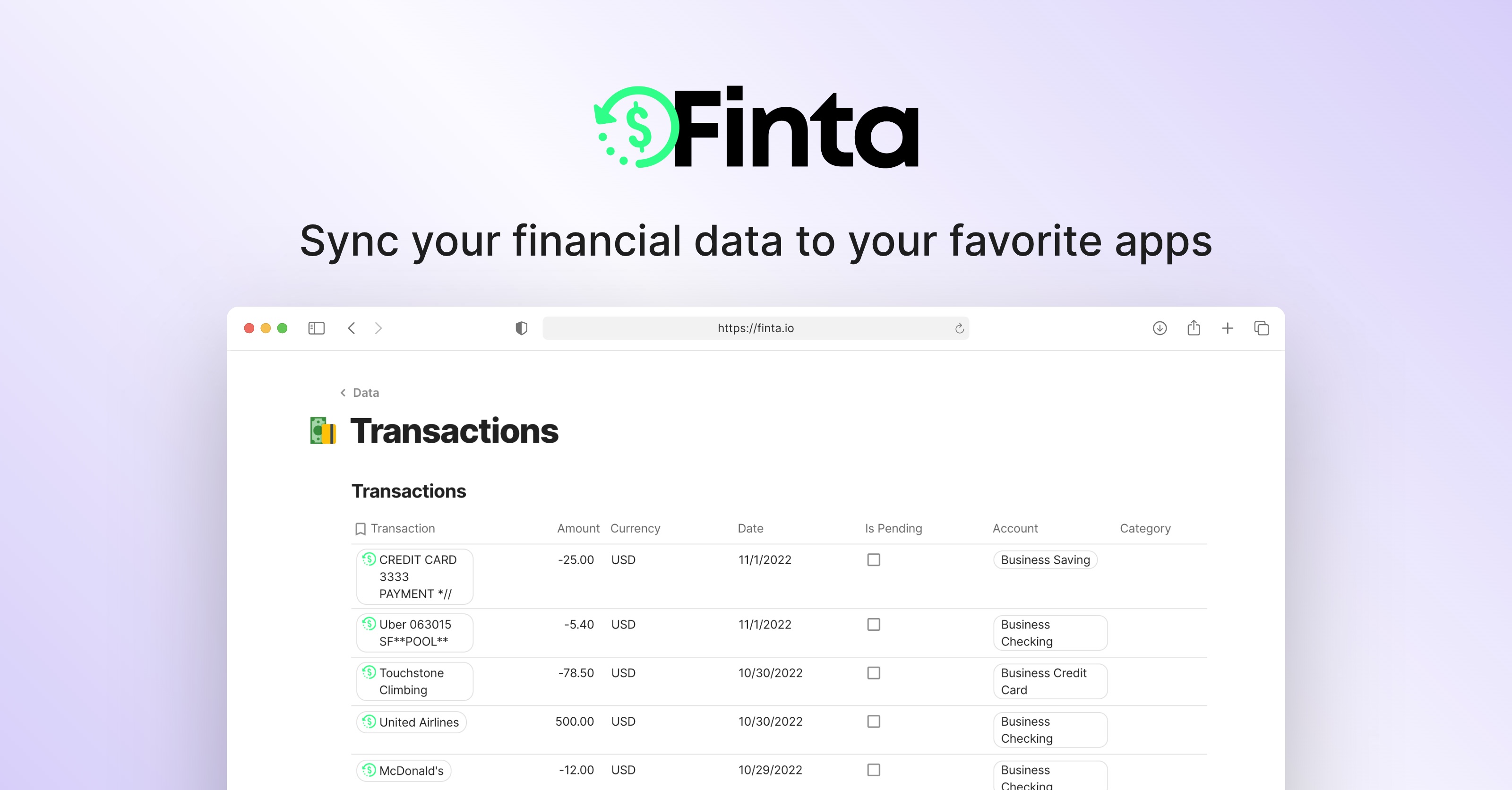 Finta automatically syncs your account balances, transactions, investments, and Stripe data to your favorite apps so that you can manage your finances how you want, where you want. You can use it to power your personal and business finances in Notion, Google Sheets, Coda, and Airtable.