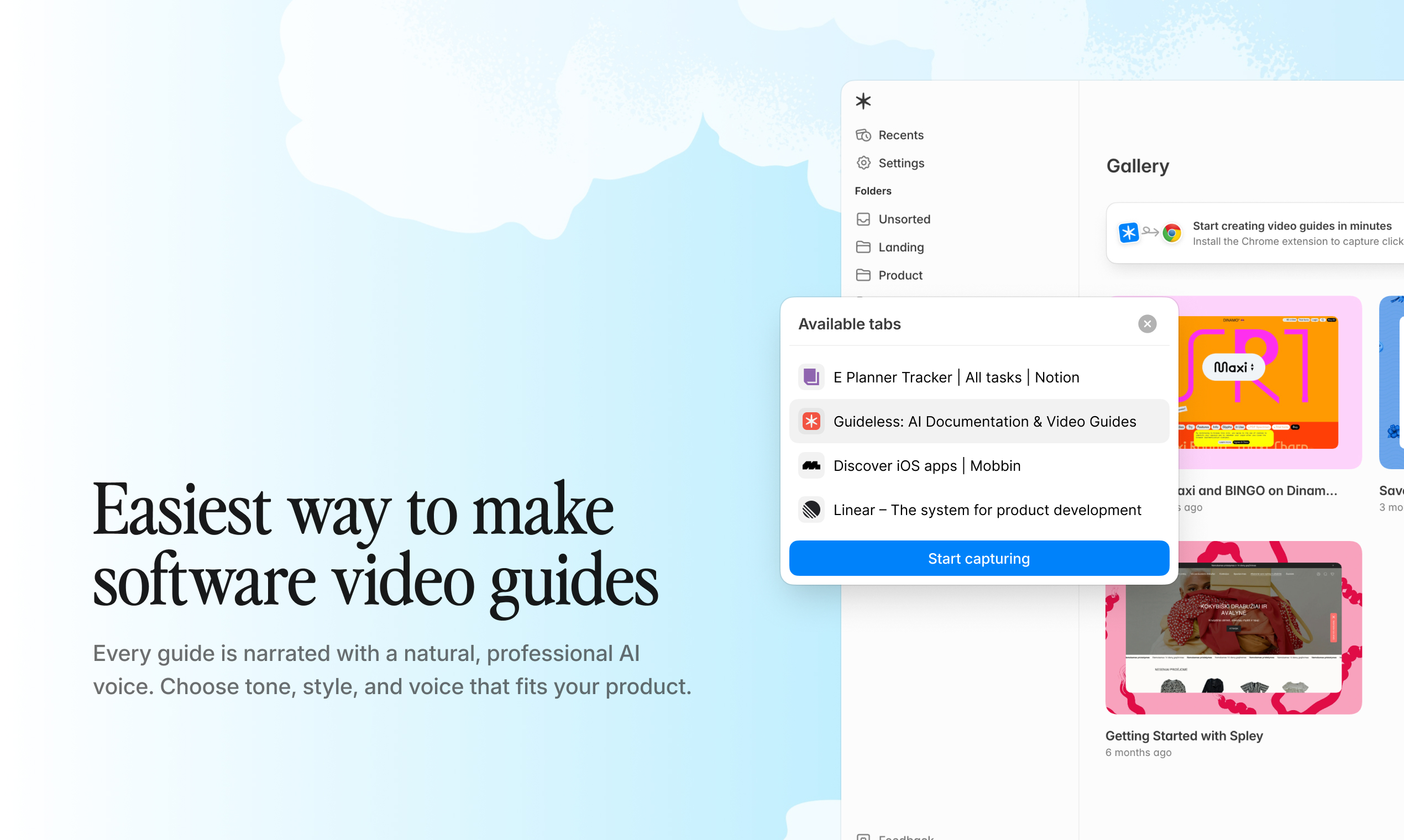 We built Guideless out of frustration with existing walkthrough tools. Everything we tried felt bloated with unnecessary features and still produced mediocre output. So we obsessed over UX and output quality. We built effortless capture with auto-generated captions, added AI refinements, and a wide selection of natural-sounding, multi-language AI voiceovers. The result is on-brand guides that look clean, sound premium by default, and can be instantly shared, embedded, or exported to MP4.