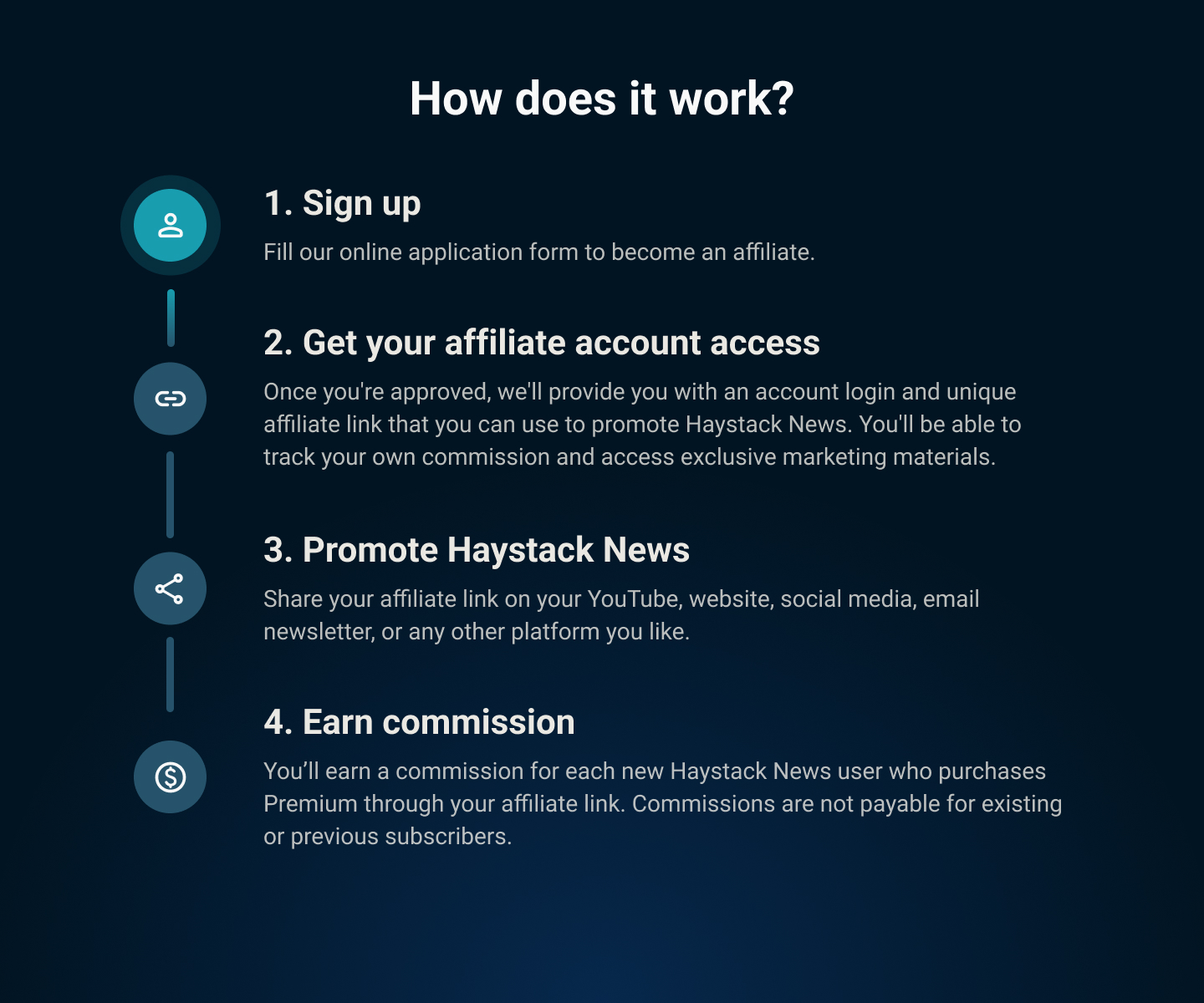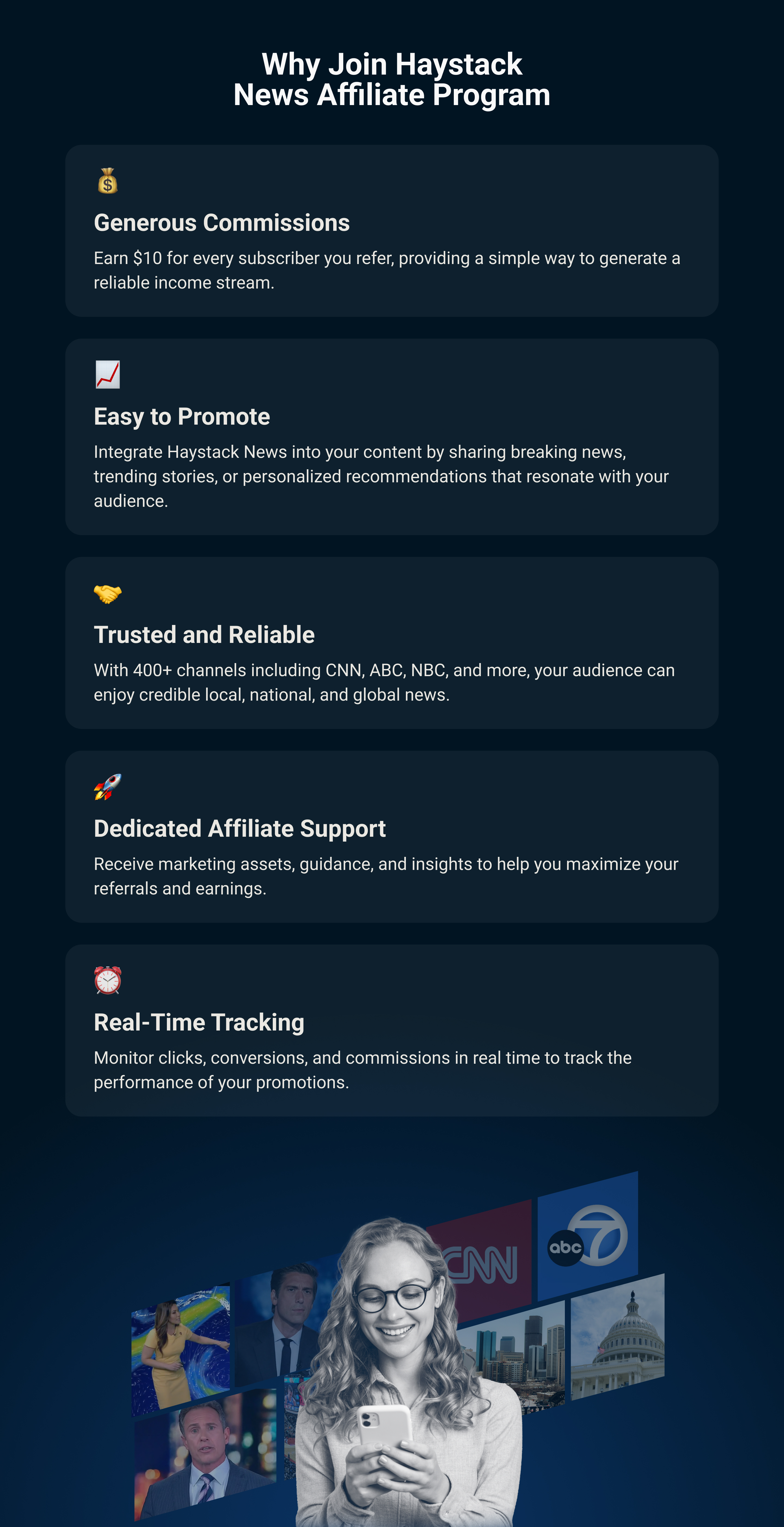 Turn your influence into earnings! With ad-free news from 400+ channels, Haystack News keeps viewers informed and engaged. You can earn a commission every time someone creates a new account and pays for a subscription using your link.