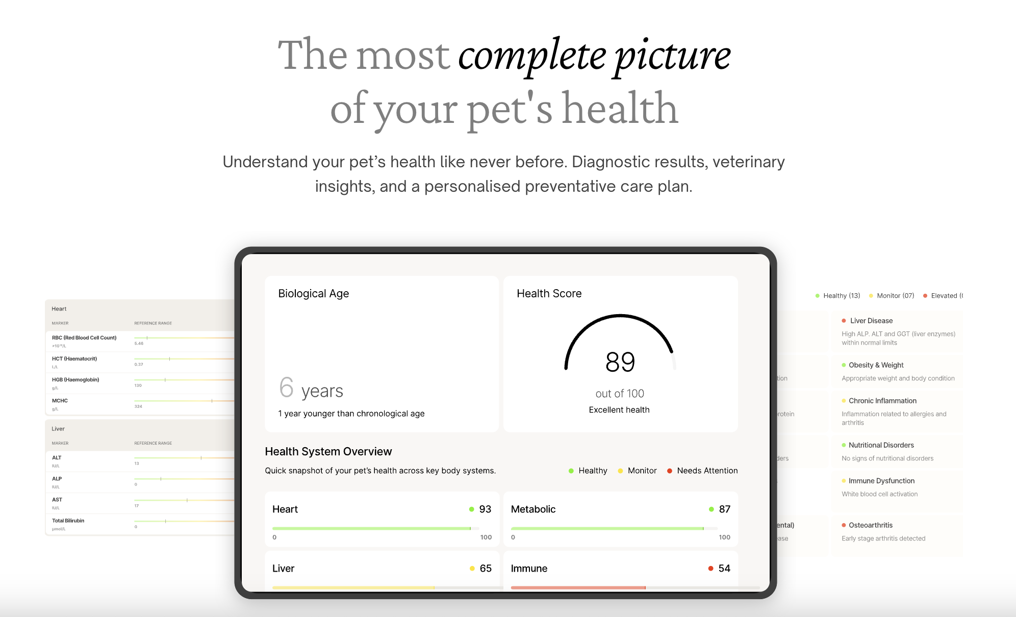 An easily interpretable scorecard report & follow-up telehealth consultation that breaks down the pet's condition by risk factors (e.g. liver, gut & microbiome, joint health) and makes an estimate of their Biological Age.