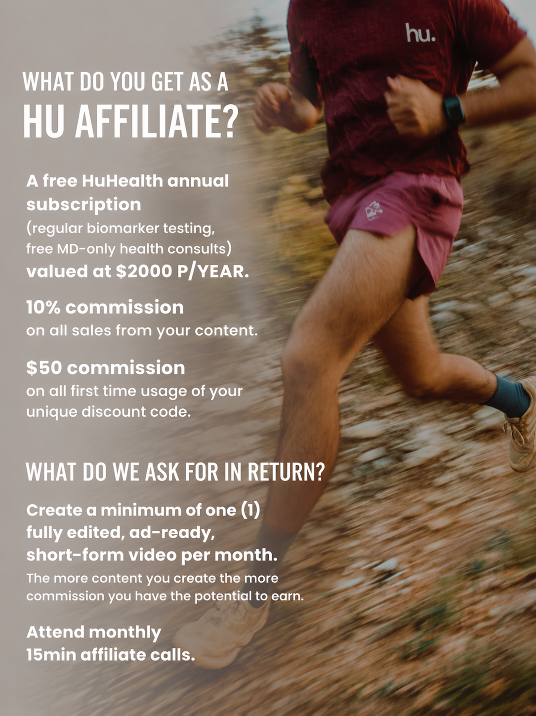 This program is perfect for content creators, health coaches, fitness influencers, and wellness advocates who want to promote products that align with their values. Whether you focus on longevity, fitness, biohacking, or general wellness, HuHealth's precision medicine approach resonates with health-conscious audiences.