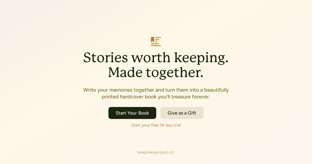 The Keepsake Project helps families write their memories together and turn them into beautifully printed hardcover books they'll treasure forever. With real-time collaboration, thoughtful writing prompts, professional layouts, and premium local printing, Keepsake makes it easy for families to capture and preserve the stories that matter most — together.