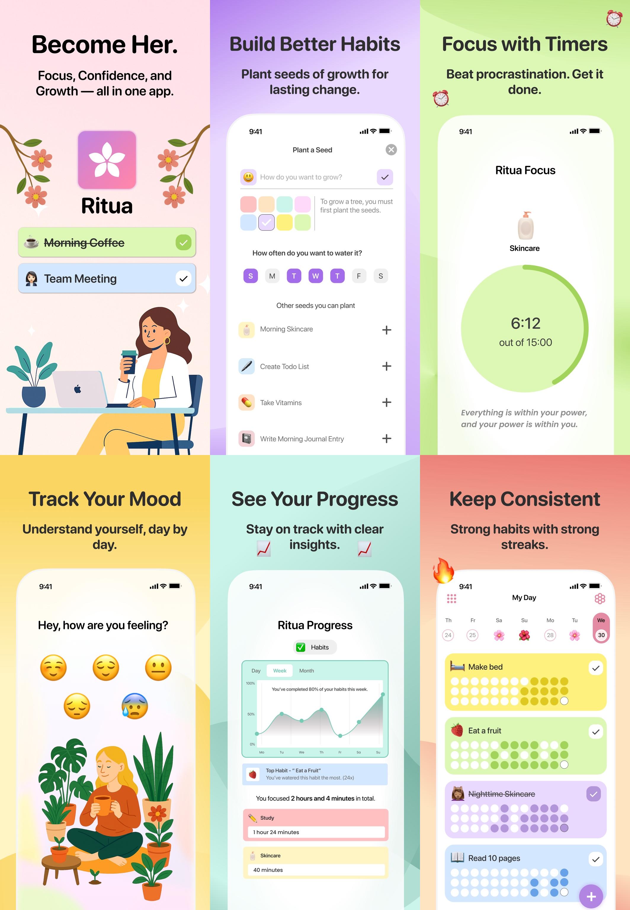 Ritua is the modern lifestyle app that helps women build the routines, confidence, and discipline they need to become the version of themselves they aspire to be. It combines habit tracking, wellness, and productivity — all in one aesthetic, empowering experience.