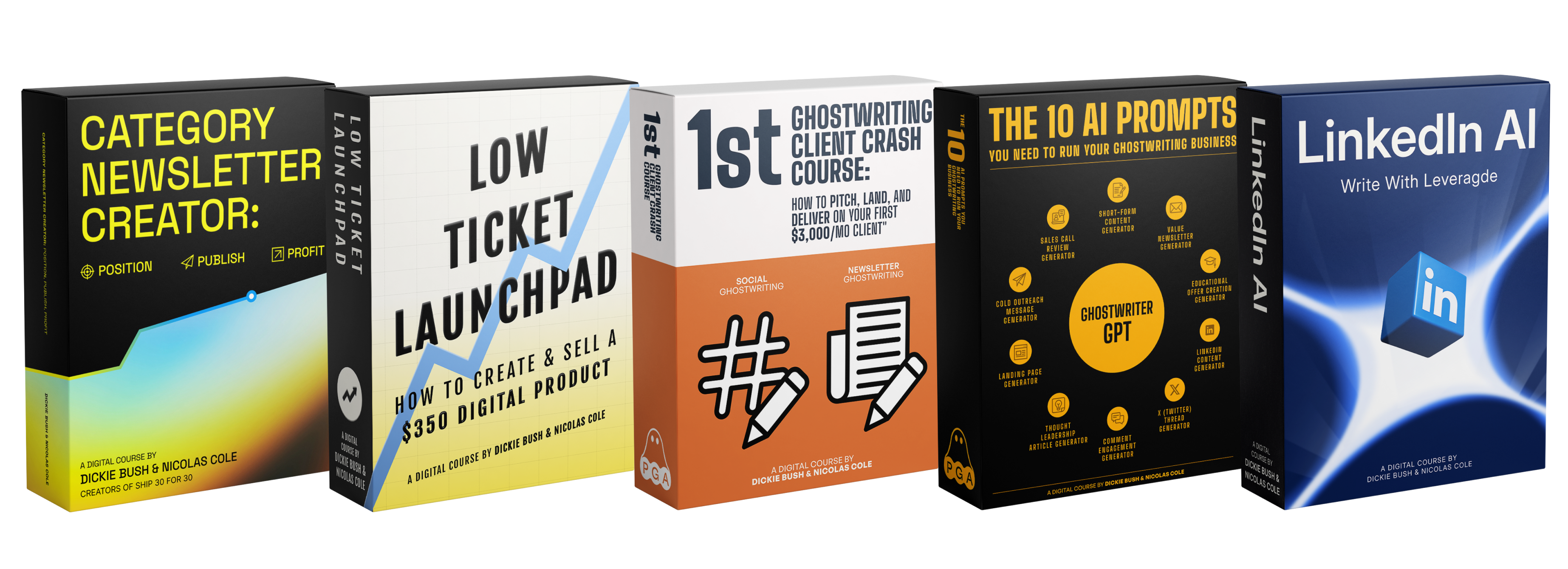 🚢 Ship 30 for 30. The flagship course for beginner writers to help them build a daily writing habit, create a library of content by publishing every day for 30 days, and start attracting a niche audience online.